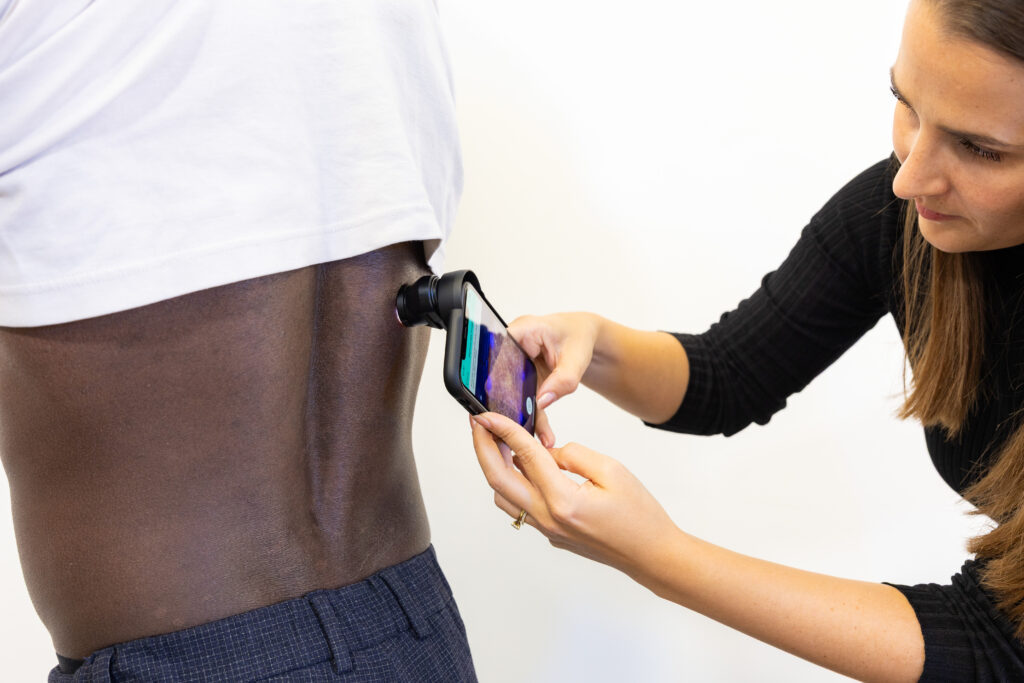 After a patient has been referred by their GP into the new, thrice-weekly tele-dermatology service, healthcare staff will take detailed photographs of any suspicious skin lesions.