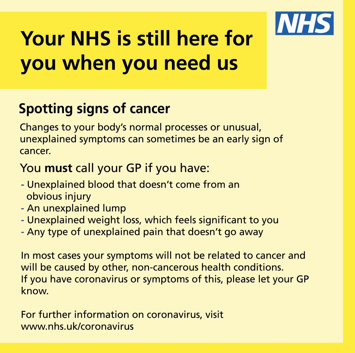 Please click here for a video message about the importance of seeking help and click here for NHS advice on spotting signs of cancer.