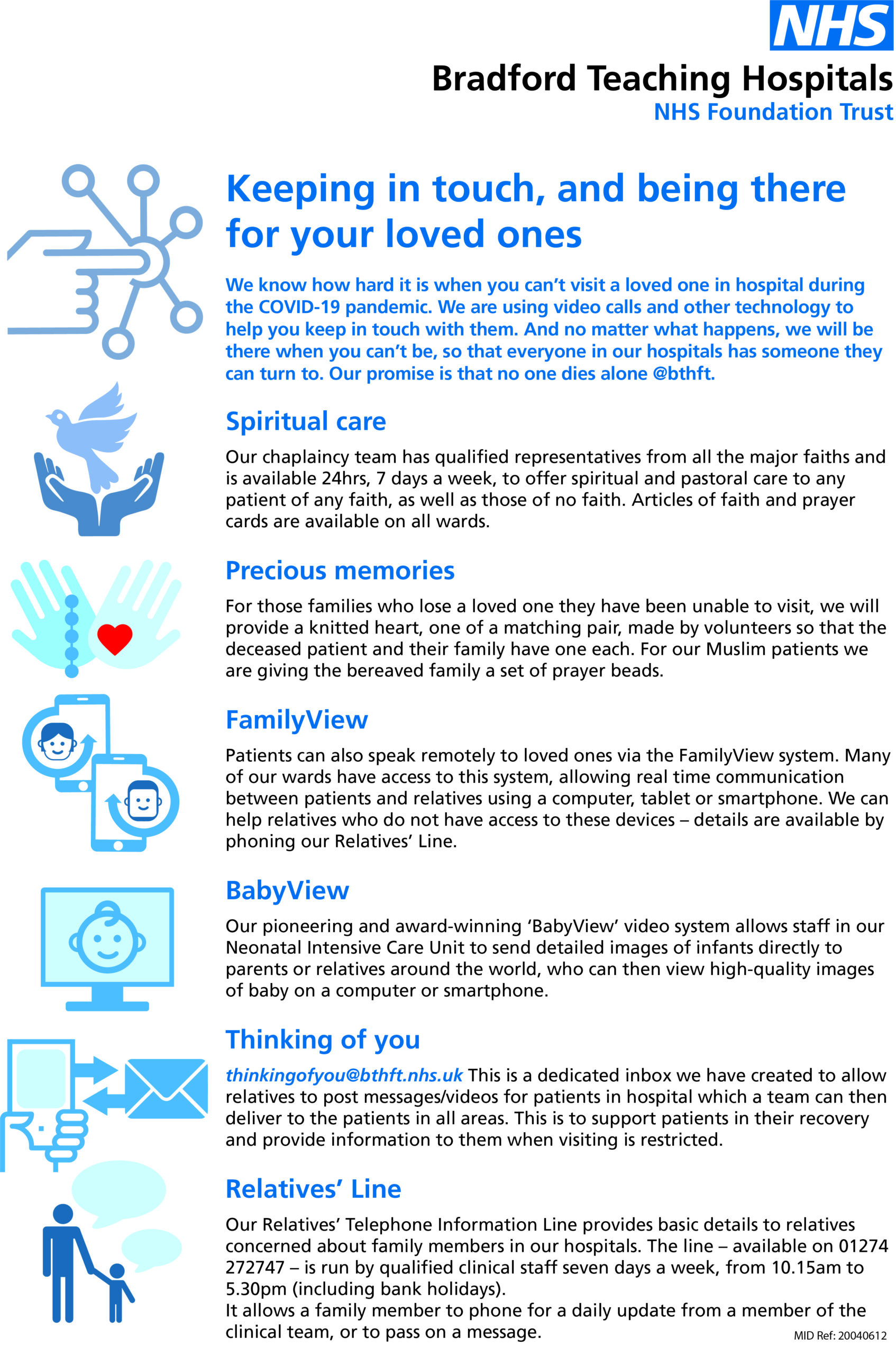 We have set up a new telephone information line for relatives concerned about inpatients. Please call 01274 272747, from 10:15am to 5:30pm (including bank holidays).