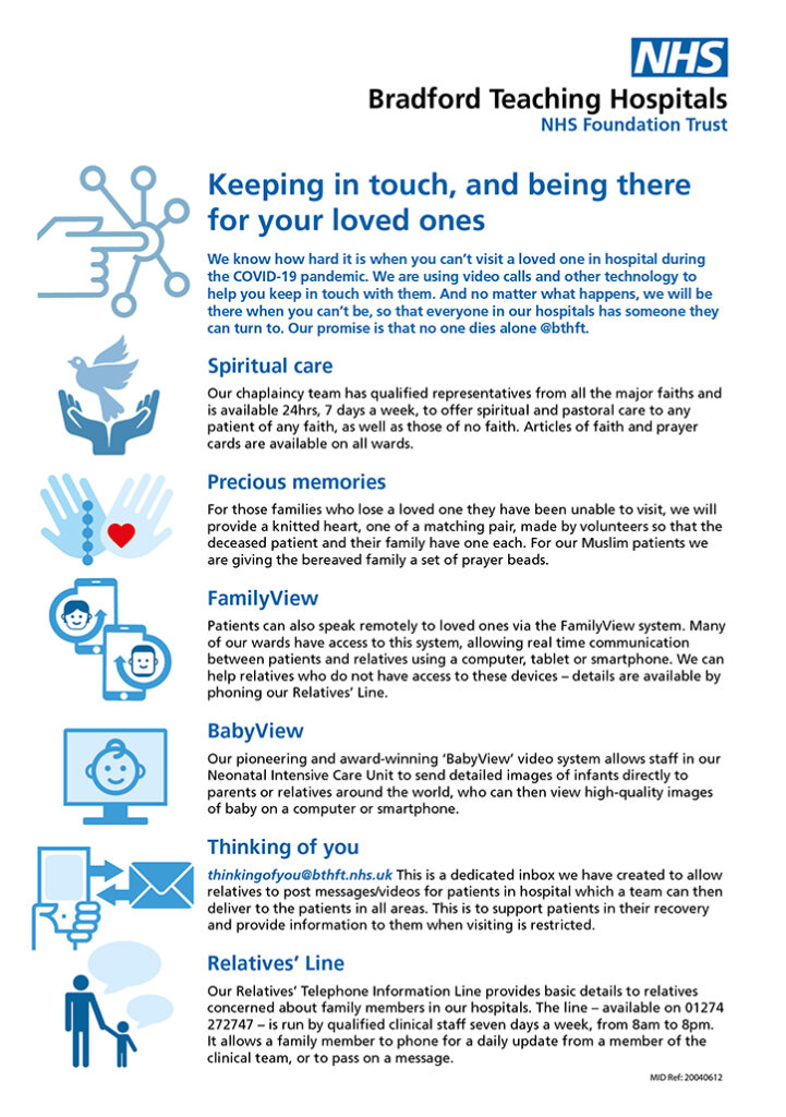 • Relatives’ Line – 01274 272747 which allows a family member to phone for a daily update from a member of the clinical team from 8am-8pm, or to pass on a message.