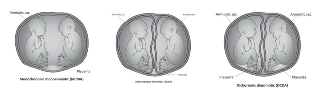 • Monochorionic Monoamniotic (MCMA) – This means that both babies share a placenta and are within the same sac. This is a much rarer type of twin pregnancy.