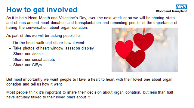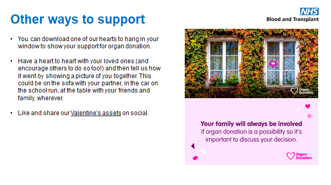 As part of this Heart-to-Heart campaign, NHS Blood and Transplant will be sharing a video by spoken word artist Adaya Henry to help encourage more people to have the conversation about organ donation. To view the video visit: https://youtu.be/eC_TFqdVKRA.